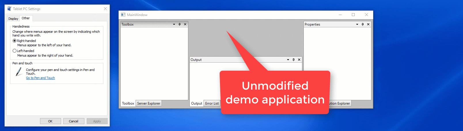 As for the resizing. The resize functionality does not take into consideration the handedness set to right-handed. What I can suggest you is to ignore the windows settings using the following code(called after InitializeComponents()) when the application launch.