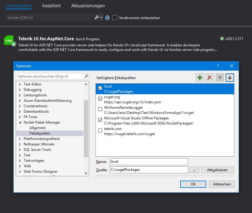 I am currently programming an ASP.NET Core web application using the Nuget package Telerik UI for ASP.NET Core. In order to use this package I have given a local path on my hard drive where the nupkg file is located. (see picture 1)
