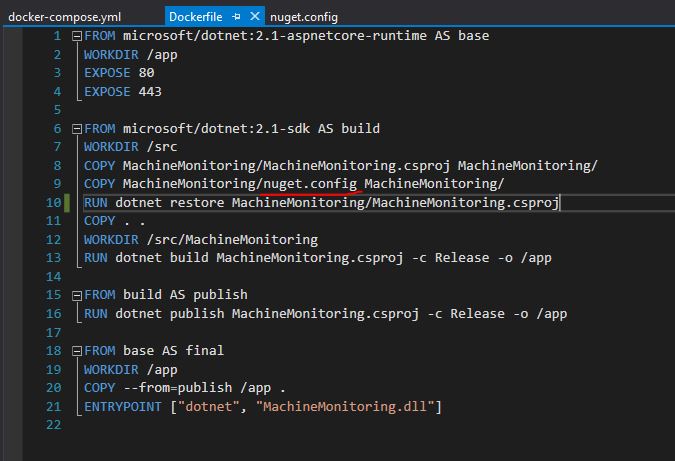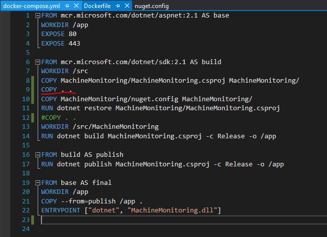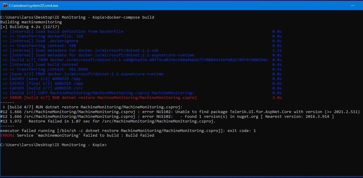 For the containerization I created the Dockerfile and the Docker-Compose. Everything worked fine during development, but as soon as I try to containerize the app with the command "docker-compose build", I get the following error. -> Unable to find package Telerik.UI.for.AspNet.Core with version> = 2021.2.511 (see picture 2)