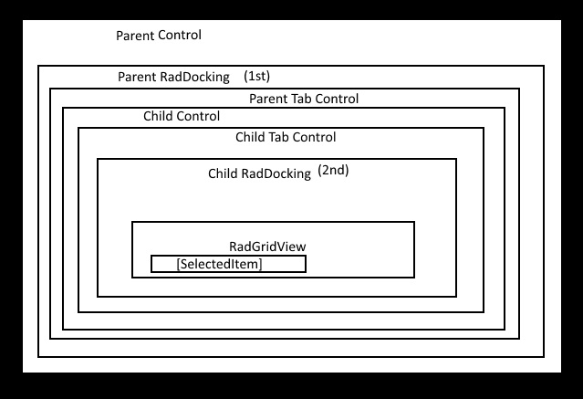 The parent control contains a RadDocking control which encompasses a Tab control, and the child control resides in one of these Tab controls, where the RadDocking control resides in another TabControl inside the child control. The parent and child controls each have their own Views and VMs.