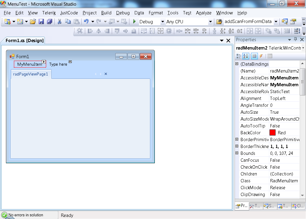 2. Drag a RadMenu from the Toolbox onto Form1. The menu defaults to Dock:Top.