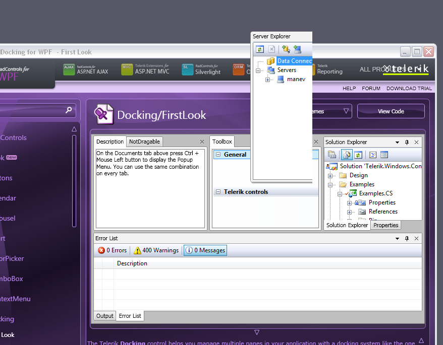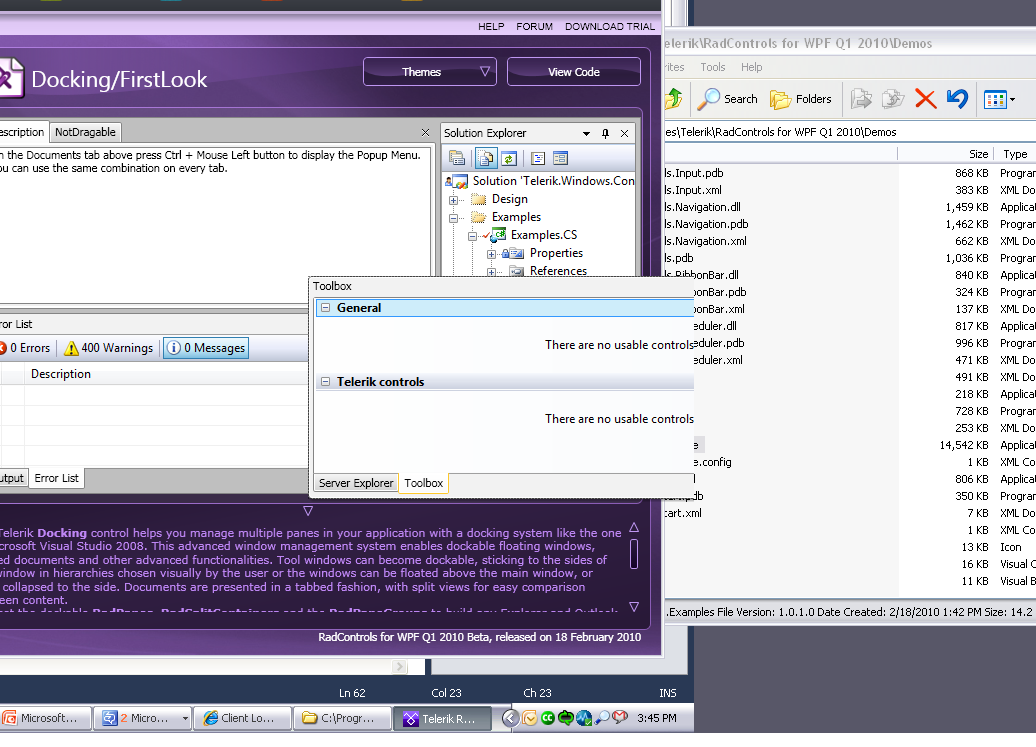 I installed the Beta (Q1 2010) and was using the Docking feature in the Docking/FirstLook demo. If I pull out the control (floating window) and try to drag it onto another monitor, it disappears. For example, it will show half of the floating window if dragged in between monitors (see 1st screen shot).