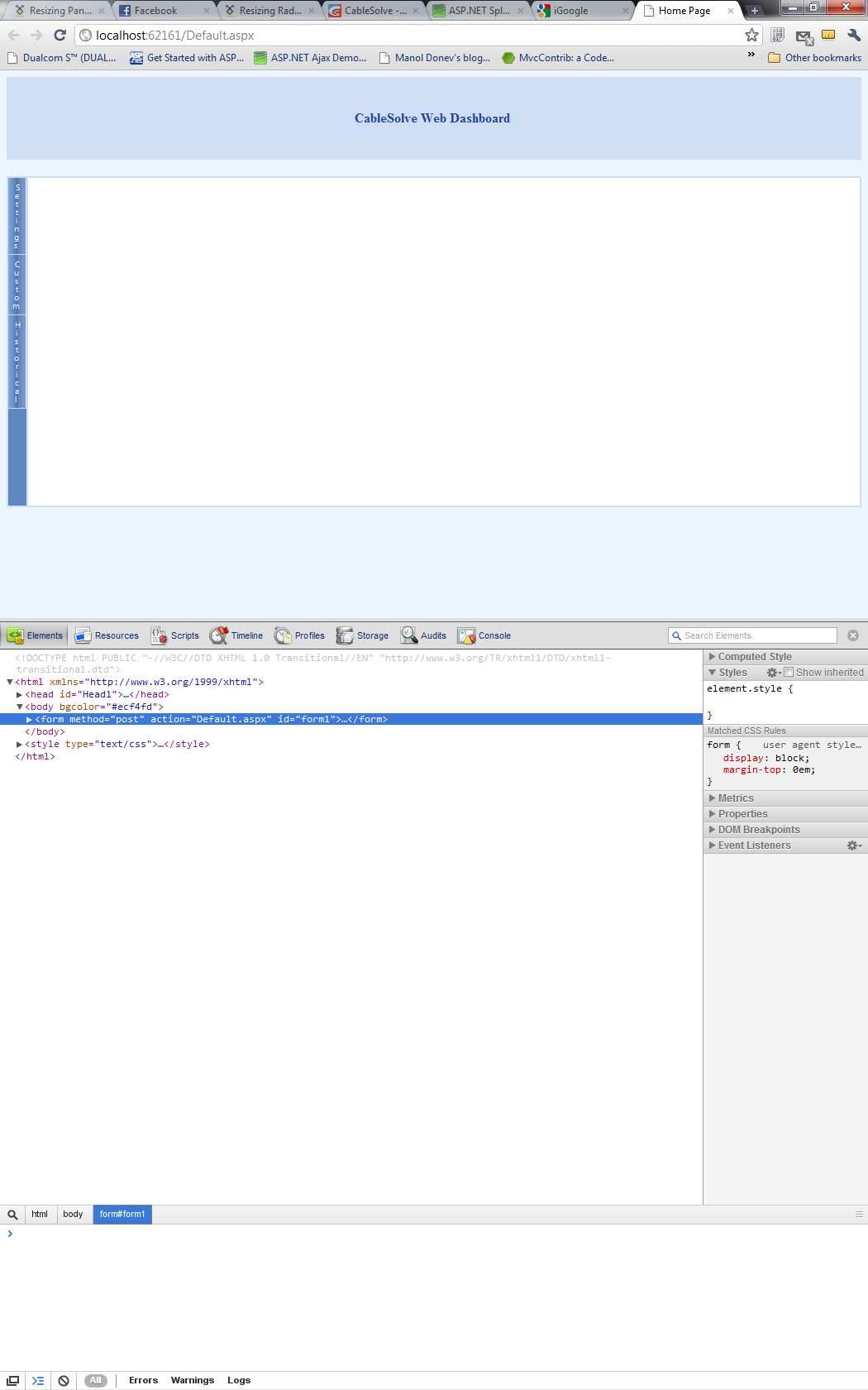 <telerik:RadSplitter ID="RadSplitter1" Runat="server" Width="100%" BorderSize="2" OnClientLoad="OnSplitterLoaded" BackColor="White" CssClass="RoundedStyle" Height="600px" Skin="Web20" > <telerik:RadPane ID="RadPane1" Runat="server" Scrolling="None" Width="20px" BackColor="#6086C1" > <telerik:RadSlidingZone ID="RadSlidingZone1" Runat="server" ClickToOpen="True" BackColor="#6086C1" Width="20px" Skin="Web20" > <telerik:RadSlidingPane ID="RadSlidingPane1" Runat="server" Title="Settings" Scrolling="Y" MinWidth="160" Width="160px" BackColor="#ECF4FD" > <telerik:RadListBox ID="lstBxSettings" runat="server" Skin="Web20" EnableDragAndDrop="True" ondropped="LstBxSettings_Dropped" Width="100%" style="top: 0px; left: 0px"> <ButtonSettings TransferButtons="All" /> <Items> <telerik:RadListBoxItem ListBox="lstBxSettings" Text="Horizontal Bar" /> <telerik:RadListBoxItem ListBox="lstBxSettings" Text="Vertical Bar" /> </Items> </telerik:RadListBox> </telerik:RadSlidingPane> <telerik:RadSlidingPane ID="RadSlidingPane2" Runat="server" Title="Custom" Scrolling="Y" MinWidth="160" BackColor="#ECF4FD"> <telerik:RadListBox ID="lstBxCustom" runat="server" EnableDragAndDrop="True" ondropped="RadListBox_Dropped" Skin="Web20" Sort="Ascending" Width="100%"> <ButtonSettings TransferButtons="All" /> </telerik:RadListBox> </telerik:RadSlidingPane> <telerik:RadSlidingPane ID="RadSlidingPane3" Runat="server" Title="Historical" Scrolling="Y" MinWidth="160" Width="160px" BackColor="#ECF4FD" > <telerik:RadListBox ID="lstBxHistorical" runat="server" EnableDragAndDrop="True" ondropped="RadListBox_Dropped" Skin="Web20" Sort="Ascending" Width="100%"> </telerik:RadListBox> </telerik:RadSlidingPane> </telerik:RadSlidingZone> </telerik:RadPane> <telerik:RadPane ID="RadPane2" Runat="server" MinHeight="500" BorderColor="White" Scrolling="None" CssClass="RoundedStyle"> </telerik:RadPane> </telerik:RadSplitter>I thought it might be the fact that I had Pane1 on the LHS of my RadSplitter. I set its visibility to false, but the dockzone just grew in size and continued hanging over one edge.