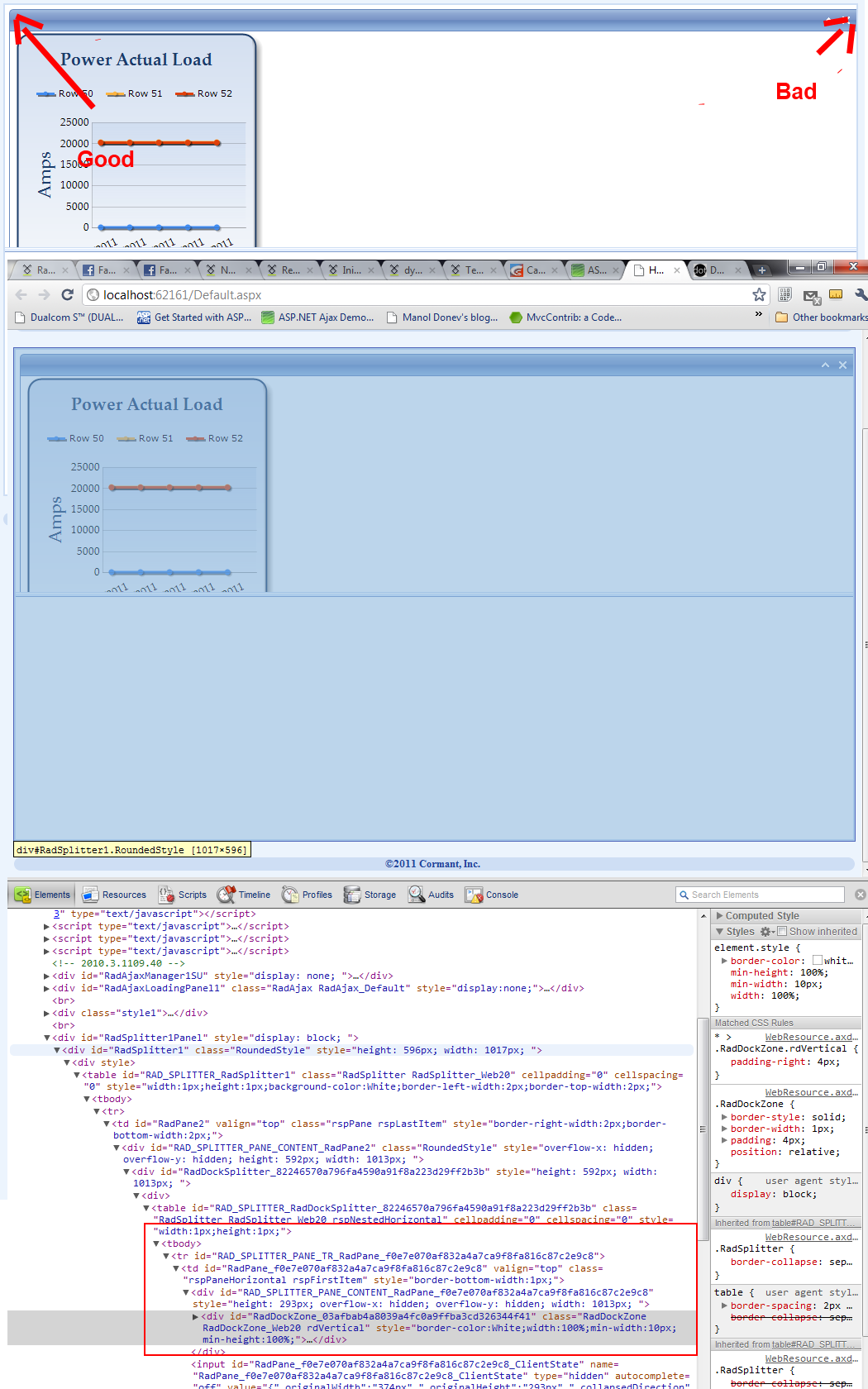 The attached picture shows where the rounded corner looks fine inside the dockzone on the LHS, but because the dockzone extends too far on the RHS it gets chopped off. I also show the HTML markup where it is clear that the the RadPane is 1013 px (the width of the RadSplitter), but then the 100% width of the DockZone it is containing expands past it.