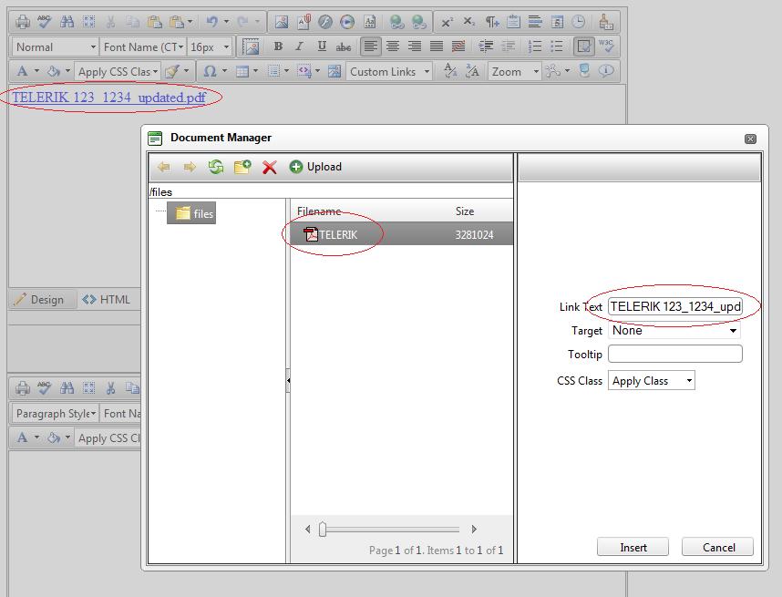 When uploading the file TELERIK_123_1235_updated.pdf (example file), the entire filename isn't listed in the filename list. The Link Text is correct, but the filename isn't. If I have similar named files (i.e. TELERIK_123_1235_updated, TELERIK_123_1236_updated), they will all show as the same filename under the Filename list in the Document Manager.