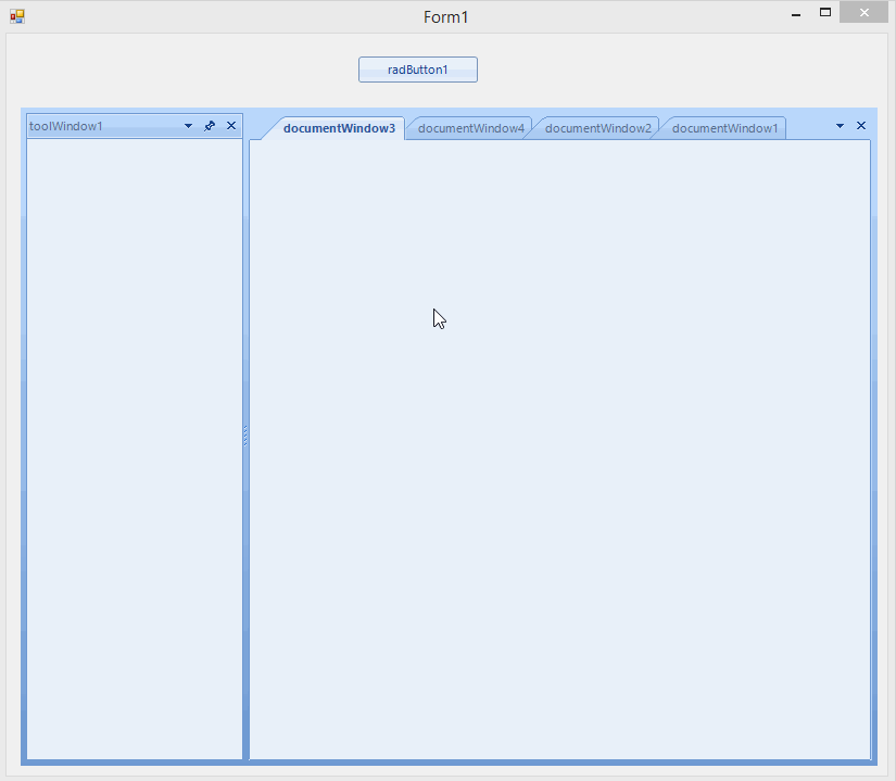 public partial class Form1 : Form{ private bool isRestored = false; public Form1() { InitializeComponent(); this.Load += Form1_Load; this.radDock1.DockStateChanged += radDock1_DockStateChanged; this.radDock1.DockStateChanging += radDock1_DockStateChanging; } private void radDock1_DockStateChanged(object sender, DockWindowEventArgs e) { if (isRestored) { this.radDock1.LoadFromXml(@"..\..\..\layout.xml"); isRestored = false; } } private void Form1_Load(object sender, EventArgs e) { foreach (DockWindow tW in this.radDock1.DockWindows.GetWindows(DockState.TabbedDocument)) { tW.CloseAction = DockWindowCloseAction.Hide; } } private void radDock1_DockStateChanging(object sender, DockStateChangingEventArgs e) { if (e.NewWindow is DocumentWindow) { if (e.NewDockState == DockState.Hidden) { this.radDock1.SaveToXml(@"..\..\..\layout.xml"); } else if (e.NewDockState == DockState.TabbedDocument && e.NewWindow.DockState == DockState.Hidden) { isRestored = true; } } } private void radButton1_Click(object sender, EventArgs e) { DockWindow[] hiddenWindows = this.radDock1.DockWindows.GetWindows(DockState.Hidden); foreach (DockWindow window in hiddenWindows) { window.Show(); } }}As another approach I can also suggest using the AddDocument method and specify a DockPosition for each DockWindow that you want to show back.