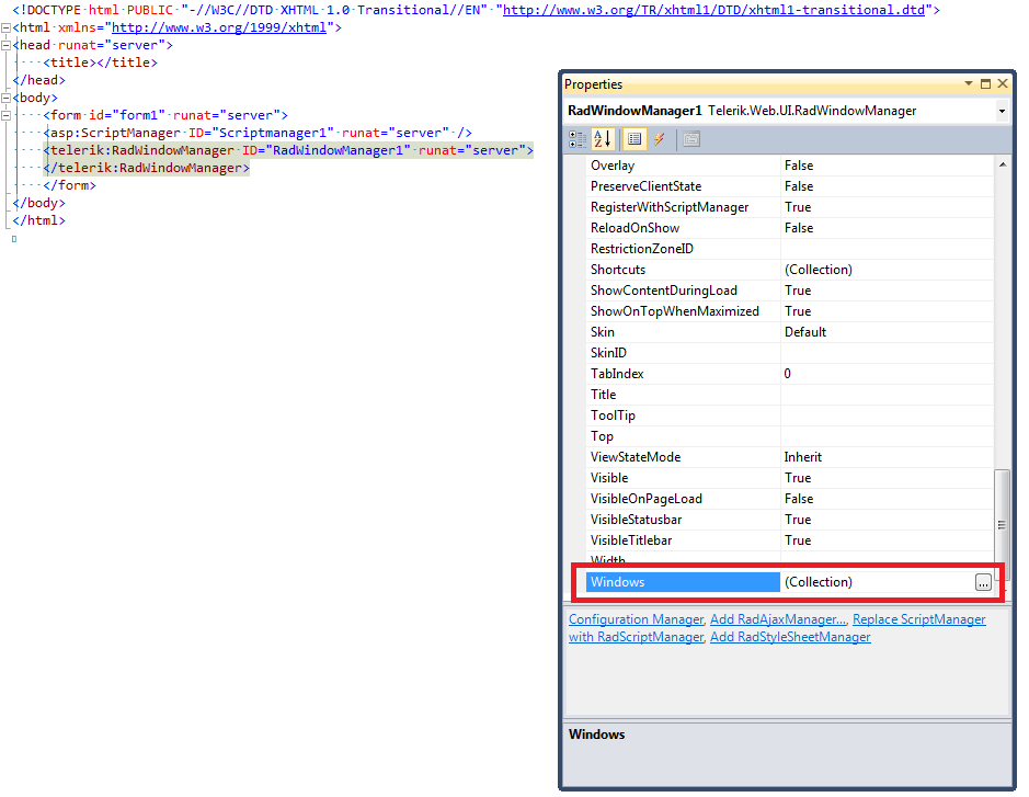 As for the windows collection - it is available as soon as you add the RadWindowManager to the page. Of course, you need to add a RadWindow to it before you can set its properties. You can alsternatively use the visual configuration manager through the smart tag if you find it more comfortable. More information on it is available in this help article.