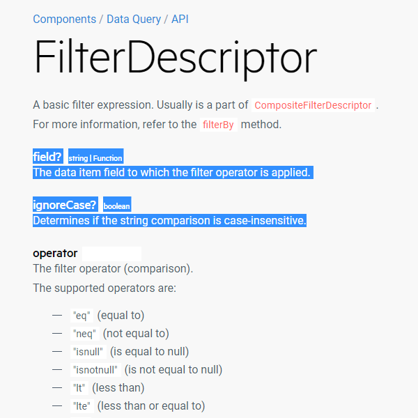 Here's an example: https://www.telerik.com/kendo-angular-ui/components/dataquery/api/FilterDescriptor/, I've also included screenshots of what I'm seeing.