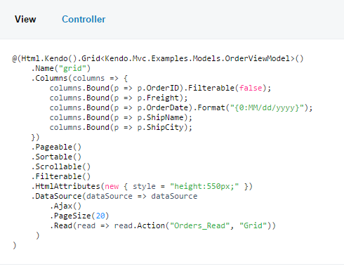 @(Html.Kendo().Grid<Kendo.Mvc.Examples.Models.OrderViewModel>() .Name("grid") .Columns(columns => { columns.Bound(p => p.OrderID).Filterable(false); columns.Bound(p => p.Freight); columns.Bound(p => p.OrderDate).Format("{0:MM/dd/yyyy}"); columns.Bound(p => p.ShipName); columns.Bound(p => p.ShipCity); }) .Pageable() .Sortable() .Scrollable() .Filterable() .HtmlAttributes(new { style = "height:550px;" }) .DataSource(dataSource => dataSource .Ajax() .PageSize(20) .Read(read => read.Action("Orders_Read", "Grid")) ))Notice the Read method on the DataSource method, pointing to a GET Action called "Orders_Read" in the "Grid" controller. Of course looking at the controller code example only shows: