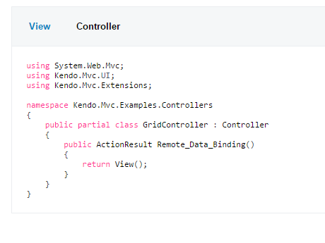 using System.Web.Mvc;using Kendo.Mvc.UI;using Kendo.Mvc.Extensions;namespace Kendo.Mvc.Examples.Controllers{ public partial class GridController : Controller { public ActionResult Remote_Data_Binding() { return View(); } }}No Orders_Read action there, and no clue as to what other actions the DataSource object can make use of in this Grid context. I assume the user is supposed to go look up the DataSource component now, which may or may not have an HtmlHelper. I've noticed that about a few other components... needing to do something, trying to find hhelp and it takes one to the Kendo UI documentation, where the syntax and building of these components is vastly different than the HTML Helpers of the MVC libraries.