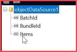 I need to build two different reports from this data: one that aggregates the BundleItems (contained in the Items property), and one that displays the list of BundleItems and their fields. I can drag-drop [= Fields.BatchId] and [= Fields.BundleId] to the report designer (I'm using VS integrated designer) and that works fine. I'm binding the datasource to the report via: