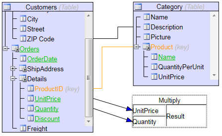 I am looking for controls that will enable me to easily draw diagrams that are like SQL relationships. Basically with each object having a title (table name), and having multiple properties under it (like table columns). And then I want to link the properties in one object to a property in another object (like SQL links). similar to the attached image.