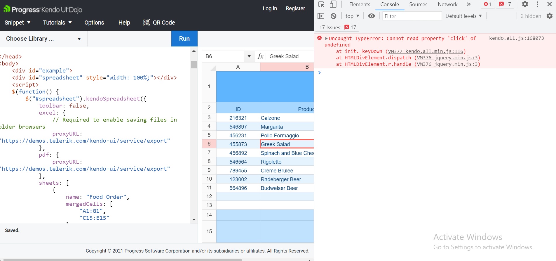 I am using Telerik spreadsheet in my web page. I have set the toolbar option to false as it was not needed for my use. When I tried the keyboard short cuts Ctrl + b and Ctrl + i the page console shows an error. I don't know if this creates any issues in the spreadsheet. I tried the same in the Telerik demo with toolbar option set to false and the console shows error in that too. I have attached the screenshot of demo in which I checked. Please take a look at this error as I don't know if it creates any further issues in the spreadsheet.