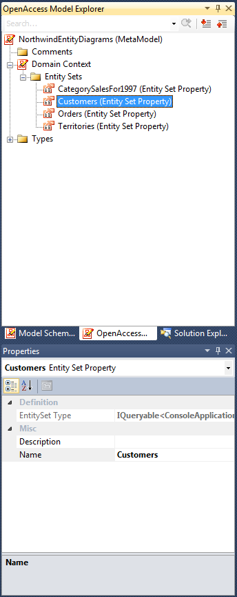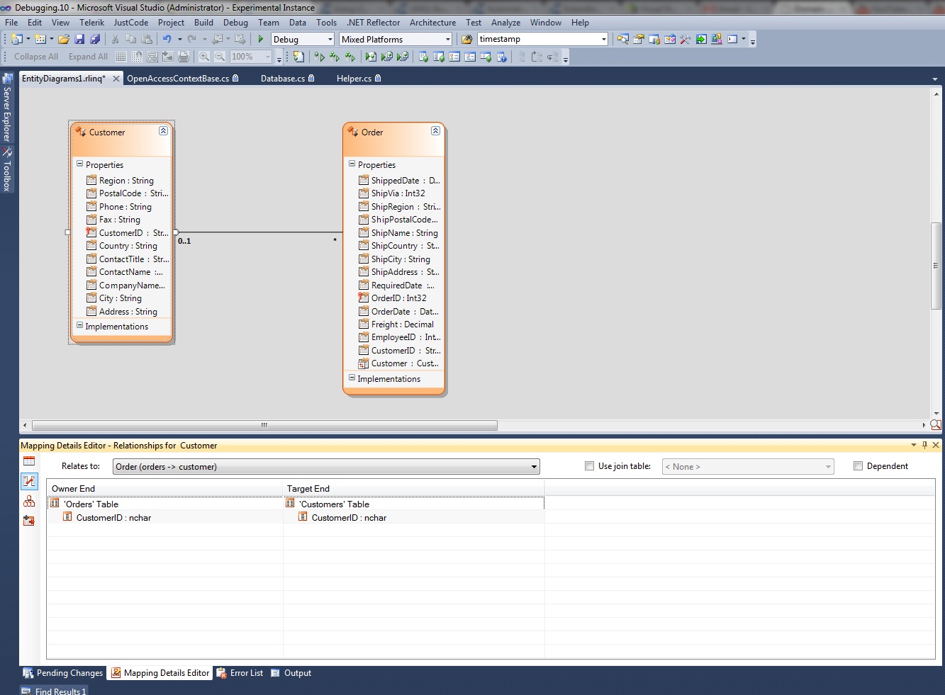 1) I have a Customer table and a CustomerAddress table. There are five different FK's to CustomerAddress from customer, for five different address types. By default (old and new), the orm creates "CustomerAddress1, CustomerAddress2.... etc, under customer. In the old ORM, it was simple to identify which one was which (and thus rename). In the Domain Model, there is NOTHING in the GUI that shows what they are . I have to open the underlying .cs file to find out, and then go back to the gui and rename. That's kind of dumb, isn't it? Is there another way to identify them. There is nothing in properties, that's for sure, nor is there anything in properties under the OpenAccess Model Explorer. There are properties for them, but none that identify at least source and target fields. Just that would be helpful.
