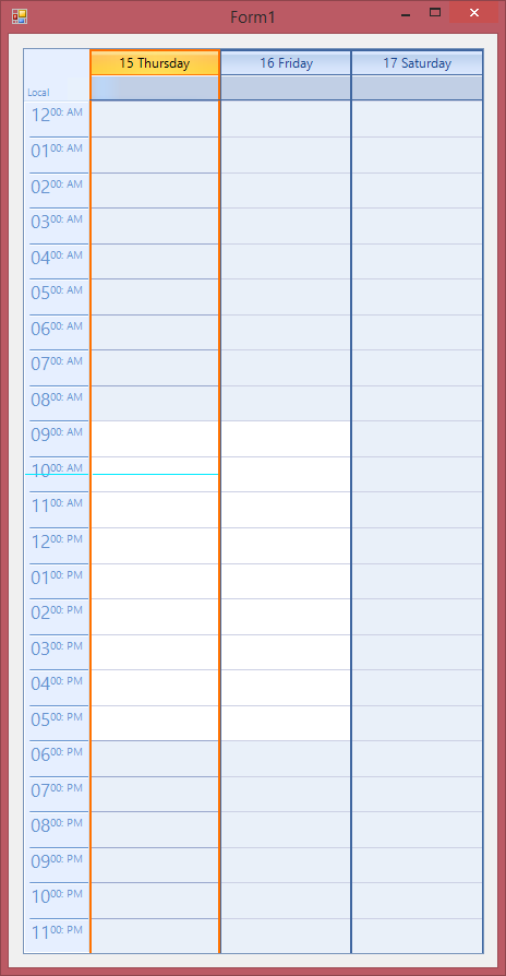 public partial class Form1 : Form{ public Form1() { InitializeComponent(); RulerPrimitive ruler = (this.radScheduler1.SchedulerElement.ViewElement as SchedulerDayViewElement).DataAreaElement.Ruler; ruler.FormatStrings = new RulerFormatStrings("hh", "mm: tt", null, null); ruler.RulerWidth = 60; }}You could also subscribe to RulerTextFormatting event and in the handler perform additional formatting and styling of the text which is going to be rendered in the ruler.