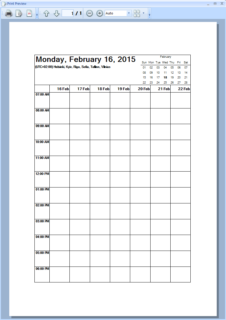 Public Class Form1 Sub New() InitializeComponent() Dim weeklyCalendarStyle As New SchedulerWeeklyCalendarPrintStyle() weeklyCalendarStyle.AppointmentFont = New System.Drawing.Font("Segoe UI", 12, FontStyle.Regular) weeklyCalendarStyle.HeadingAreaHeight = 120 weeklyCalendarStyle.HoursColumnWidth = 60 Me.RadScheduler1.PrintStyle = weeklyCalendarStyle AddHandler weeklyCalendarStyle.CellElementFormatting, AddressOf weeklyCalendarStyle_CellElementFormatting End Sub Private Sub weeklyCalendarStyle_CellElementFormatting(sender As Object, e As PrintSchedulerCellEventArgs) Dim cell As SchedulerPrintCellElement = TryCast(e.CellElement, SchedulerPrintCellElement) If cell IsNot Nothing AndAlso cell.DateFormat = "hh:mm" Then cell.DateFormat = "hh:mm tt" End If End SubEnd ClassAdditional information on the print styles in the RadScheduler element you can find here. I am also sending you a screenshot of the result on my end using the code in the snippet above.