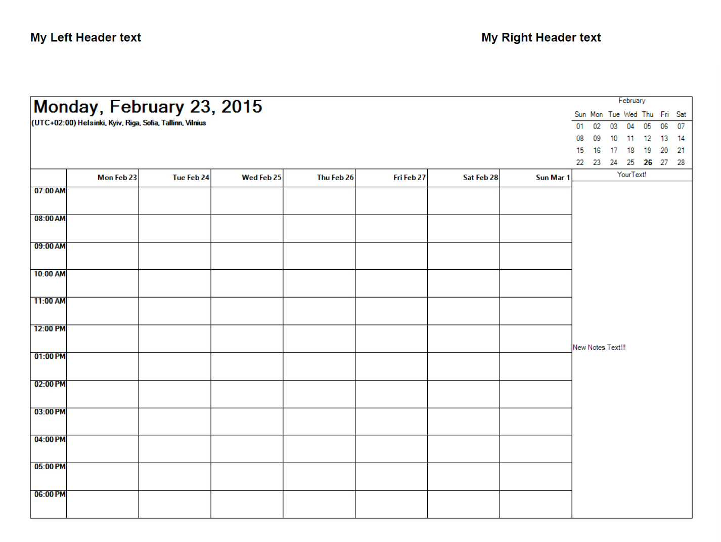 Public Class Form1 Private weeklyCalendarStyle As New SchedulerWeeklyCalendarPrintStyle Sub New() InitializeComponent() Dim weeklyCalendarStyle As SchedulerWeeklyCalendarPrintStyle = New SchedulerWeeklyCalendarPrintStyle() AddHandler weeklyCalendarStyle.PrintElementFormatting, AddressOf weeklyCalendarStyle_PrintElementFormatting End Sub Private Sub weeklyCalendarStyle_PrintElementFormatting(sender As Object, e As PrintElementEventArgs) Dim notesArea As NotesAreaPrintElement = TryCast(e.PrintElement, NotesAreaPrintElement) If notesArea IsNot Nothing Then notesArea.Text = "YourText!" End If End SubEnd ClassIn order to write inside the notes area you should create a CustomSchedulerWeeklyCalendarPrintStyle, I have included a sample implementation in my project, which I am sending you attached.