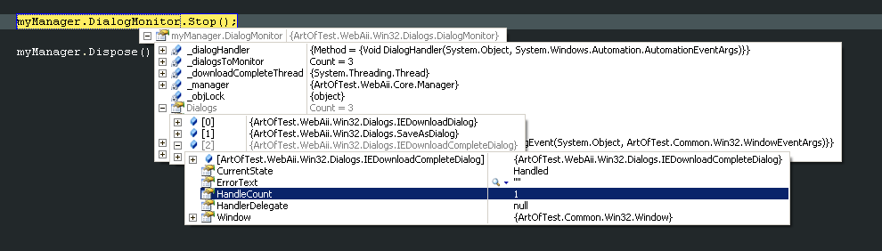 string fname = "c:\download.doc";IEDownloadDialog iedownload = new IEDownloadDialog( Browser, DialogButton.SAVE, Manager.Desktop); Manager.DialogMonitor.AddDialog(iedownload); SaveAsDialog saveas = new SaveAsDialog( Browser, DialogButton.SAVE, fname, Manager.Desktop); Manager.DialogMonitor.AddDialog(saveas); IEDownloadCompleteDialog iedownloadComplete = new IEDownloadCompleteDialog( Browser, DialogButton.CLOSE, Manager.Desktop); Manager.DialogMonitor.AddDialog(iedownloadComplete); Manager.DialogMonitor.Start(); downloadExcelLink.MouseClick(MouseClickType.LeftClick); Thread.Sleep(15000); Manager.DialogMonitor.Stop();But there is one problem: as far as I understand, for some small period of time the close button on the last dialog is disabled (I have no idea why, really). So the dialog handler clicks it when the button is inactive and nothing happens.