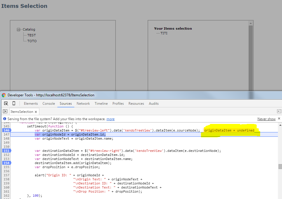 function HierarchyDragEnd(e) { setTimeout(function () { var originDataItem = $("#treeview-left").data('kendoTreeView').dataItem(e.sourceNode); var originNodeId = originDataItem.id; var originNodeText = originDataItem.name; var destinationDataItem = $("#treeview-right").data('kendoTreeView').dataItem(e.destinationNode); var destinationNodeId = destinationDataItem.id; var destinationNodeText = destinationDataItem.name; destinationDataItem.add(originDataItem); var dropPosition = e.dropPosition; alert("Origin ID: " + originNodeId + "\nOrigin Text: " + originNodeText + "\nDestination ID: " + destinationNodeId + "\nDestination Text: " + destinationNodeText + "\nDrop Position: " + dropPosition); }, 100); }