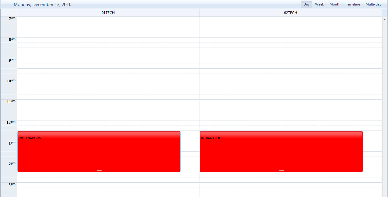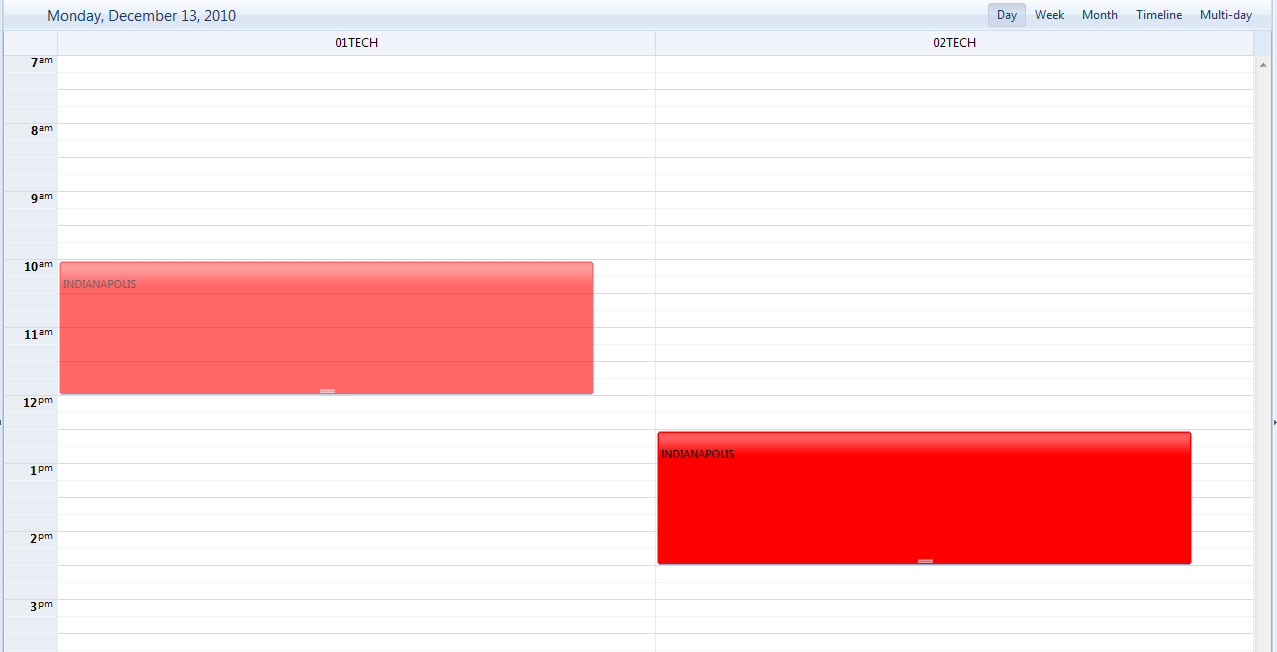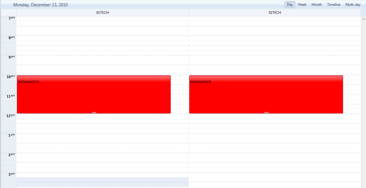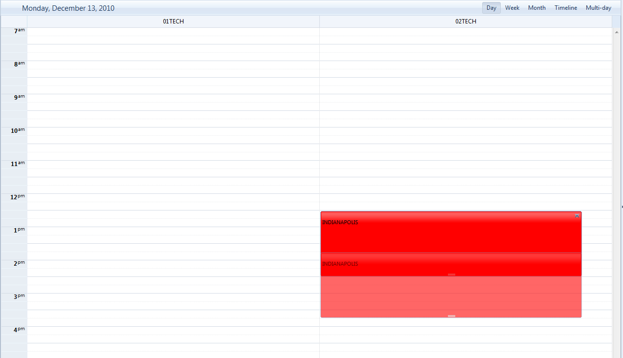 2. I then decide I want to reschedule the appointment to 10:00am so I drag the appointment listed under 01TECH from 12:30pm to 10:00am. This shows that dragging working properly.