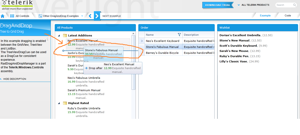 We have implemented drag and drop in gridview and treelistview. Now we are trying to implement separator when an item or items are being dropped to the destination just like the telerik silverlight example for 'Drag and drop: tree to grid drag'.