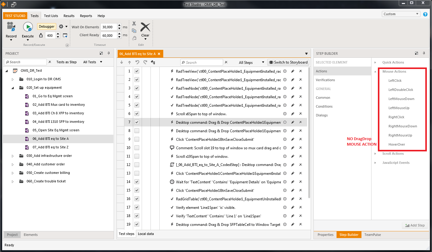 In the documentation for recording a drag and drop step, the directions state to select the DragDrop Mouse Action (Step 4). As I mentioned in my previous post, the DragDrop action is no longer on the list of Mouse Actions, so I was not able to use that procedure to record a drag and drop step in my test. See the attached screenshot. I was able to work around this issue by manually recording the drag and drop and then updating the properties of that step with the correct originating and target element information. That solved the problem of recording the drag and drop step, but it didn't solve my original issue. When I replay the drag and drop step, the originating element gets dragged to the target element, but instead of landing on and staying on the target element, once the originating element is released by the mouse, it goes back to it's original location.