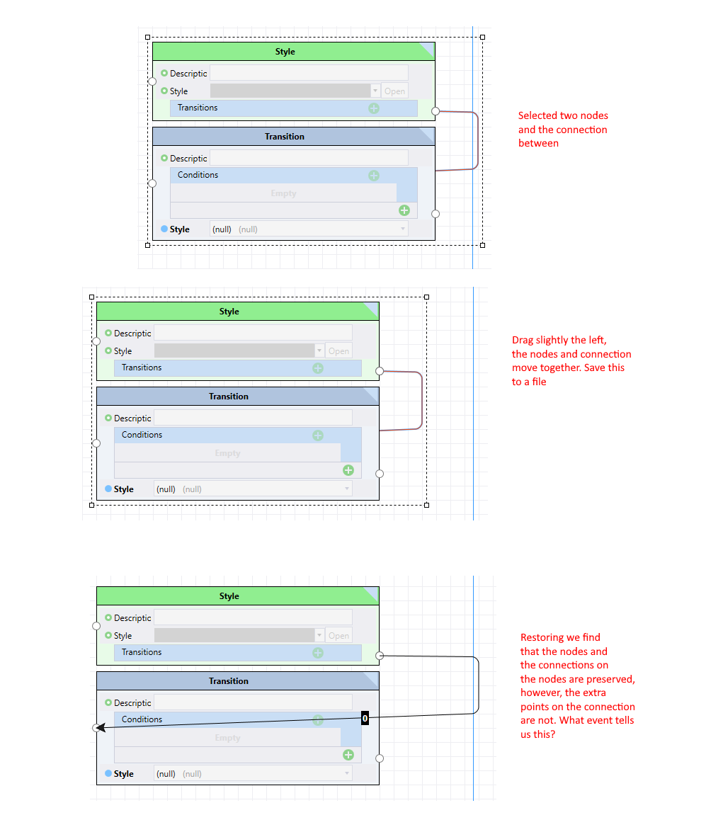 Dragging the shapes in the view is working correctly, however there's missing data, so if I save and restore, the extra connection points weren't updated so they show the old position. I'll attach a diagram of what I mean.