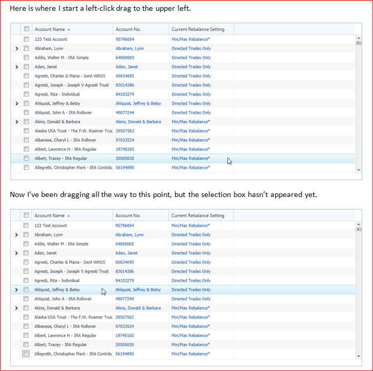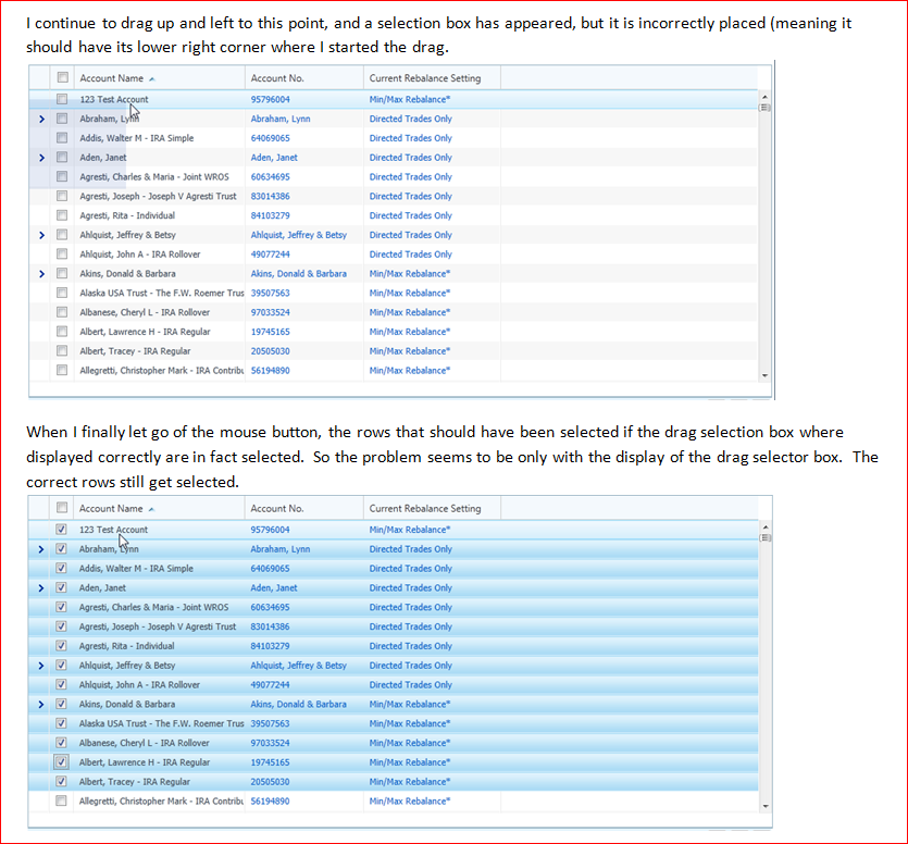 If I start the drag in the lower right part of the grid and drag upwards and to the left, the semi-transparent "selection box" does not render in the right place. Instead of having its lower right corner placed where I started the drag (which it should and does without scrolling enabled), the selection box doesn't even appear until about halfway up the grid. When I release the left mouse button to finish the drag-selected, the CORRECT rows are still selected, even though the selection box displayed improperly.