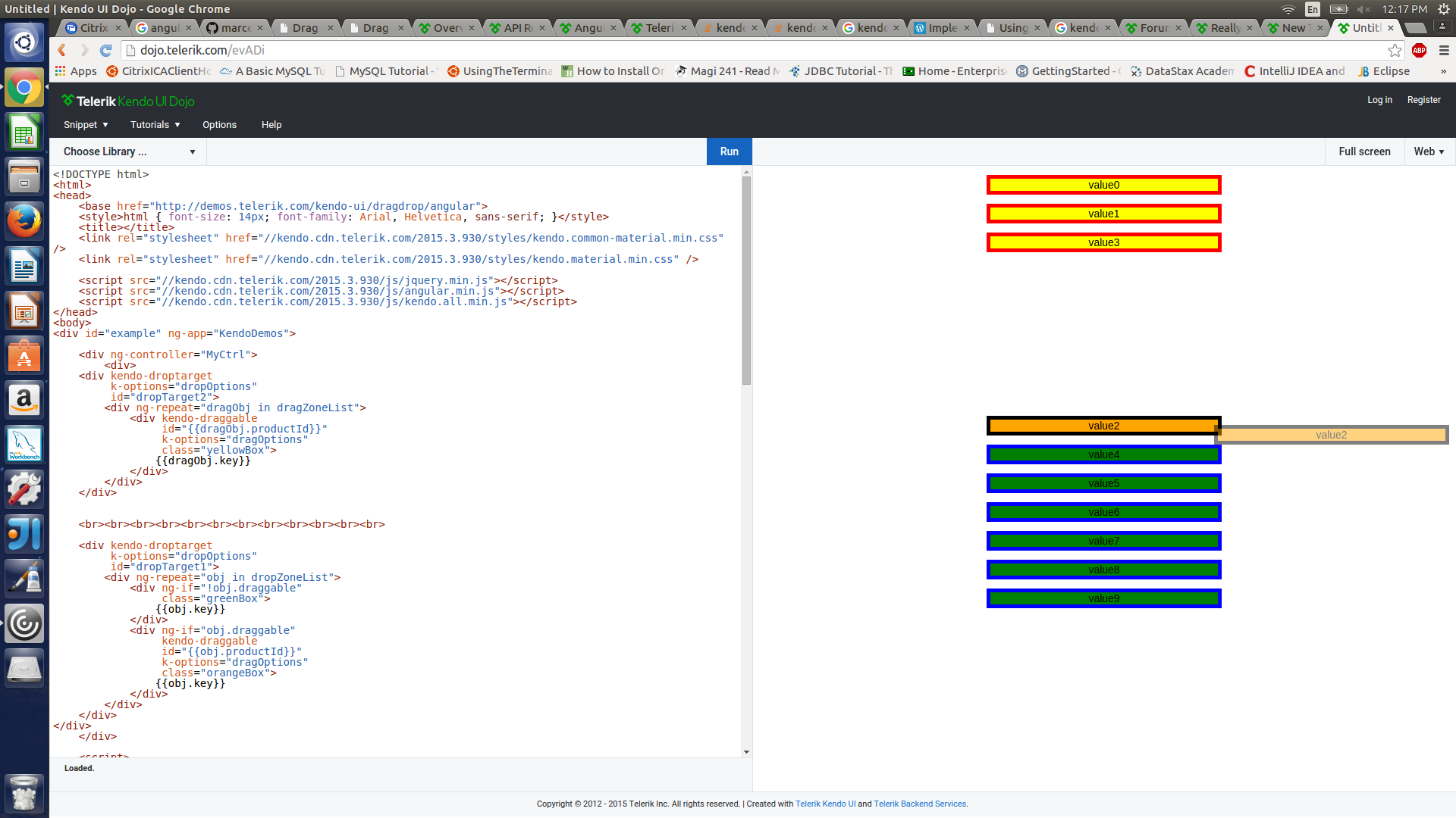 I'm trying to implement Kendo drag and drop functionality on Angulars ng-repeat. In my case i have two drop targets, in which one drop target has draggable elements on load, and the other doesn't. We can drag the elements from first drop target to the second, and these elements will be draggable in it. But when i drag these elements from the second drop target back to the first, the hint gets stuck in the second drop target. Any help will be appreciated.