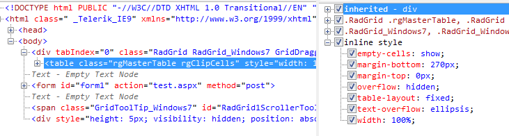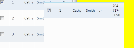 <%@ Page Language="C#" %><%@ Register Assembly="Telerik.Web.UI" Namespace="Telerik.Web.UI" TagPrefix="telerik" %><!DOCTYPE html PUBLIC "-//W3C//DTD XHTML 1.0 Transitional//EN"<html xmlns="http://www.w3.org/1999/xhtml" ><head runat="server"><meta http-equiv="content-type" content="text/html;charset=utf-8" /><title>RadControls for ASP.NET AJAX</title><style type="text/css">html{overflow:auto}html,body,form{height:100%;margin:0;padding:0;background:yellow}</style></head><body><form id="form1" runat="server"><asp:ScriptManager ID="ScriptManager1" runat="server" /><telerik:RadGrid ID="RadGrid1" runat="server" DataSourceID="XmlDataSource1" PageSize="40" Width="50%" Height="100%" Style="border: 0; outline: none" VirtualItemCount="1000" AllowSorting="True" AllowMultiRowSelection="True"> <MasterTableView TableLayout="Fixed" /> <MasterTableView> <Columns> <telerik:GridClientSelectColumn UniqueName="ClientSelectColumn" /> </Columns> </MasterTableView> <ClientSettings AllowDragToGroup="true" AllowColumnsReorder="true" EnableRowHoverStyle="true" AllowKeyboardNavigation="True" AllowRowsDragDrop="True" EnablePostBackOnRowClick="true" AllowExpandCollapse="true"> <Scrolling AllowScroll="True" EnableVirtualScrollPaging="True" UseStaticHeaders="false" SaveScrollPosition="true" /> <Resizing AllowColumnResize="true" EnableRealTimeResize="true" /> <Selecting AllowRowSelect="true" EnableDragToSelectRows="false" /> </ClientSettings> </telerik:RadGrid><asp:XmlDataSource ID="XmlDataSource1" runat="server"><Data><students> <student id="1" firstname="Cathy" lastname="Smith" suffixname="Jr" phone="704-717-0090" /> <student id="2" firstname="Cathy" lastname="Smith" suffixname="Jr" phone="704-717-0090" /> <student id="3" firstname="Cathy" lastname="Smith" suffixname="Jr" phone="704-717-0090" /> <student id="4" firstname="Cathy" lastname="Smith" suffixname="Jr" phone="704-717-0090" /> <student id="5" firstname="Cathy" lastname="Smith" suffixname="Jr" phone="704-717-0090" /> <student id="6" firstname="Cathy" lastname="Smith" suffixname="Jr" phone="704-717-0090" /> <student id="7" firstname="Cathy" lastname="Smith" suffixname="Jr" phone="704-717-0090" /> <student id="8" firstname="Cathy" lastname="Smith" suffixname="Jr" phone="704-717-0090" /> <student id="9" firstname="Cathy" lastname="Smith" suffixname="Jr" phone="704-717-0090" /></students></Data></asp:XmlDataSource></form></body></html>Kind regards,