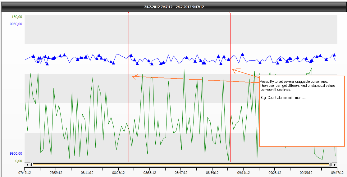 One is that we should have possibility to add&move several draggable lines on the chart area, and do calculations and analyzing from selected graphs between those lines. (see the trenddraggablecursor.png)