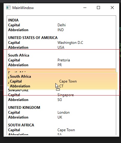 Can you suggest any sample for the above problem. I expect to be like (expectOutput.jpg) as you can see in the attached image I have two SouthAfrica ListBoxItems with different capital names (subtext). So When I try to drag any one of the items both the item has to dragged and dropped.