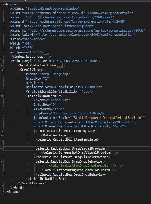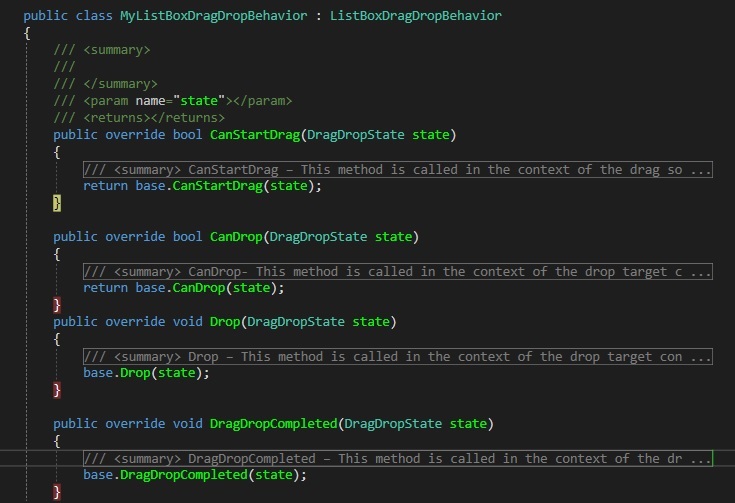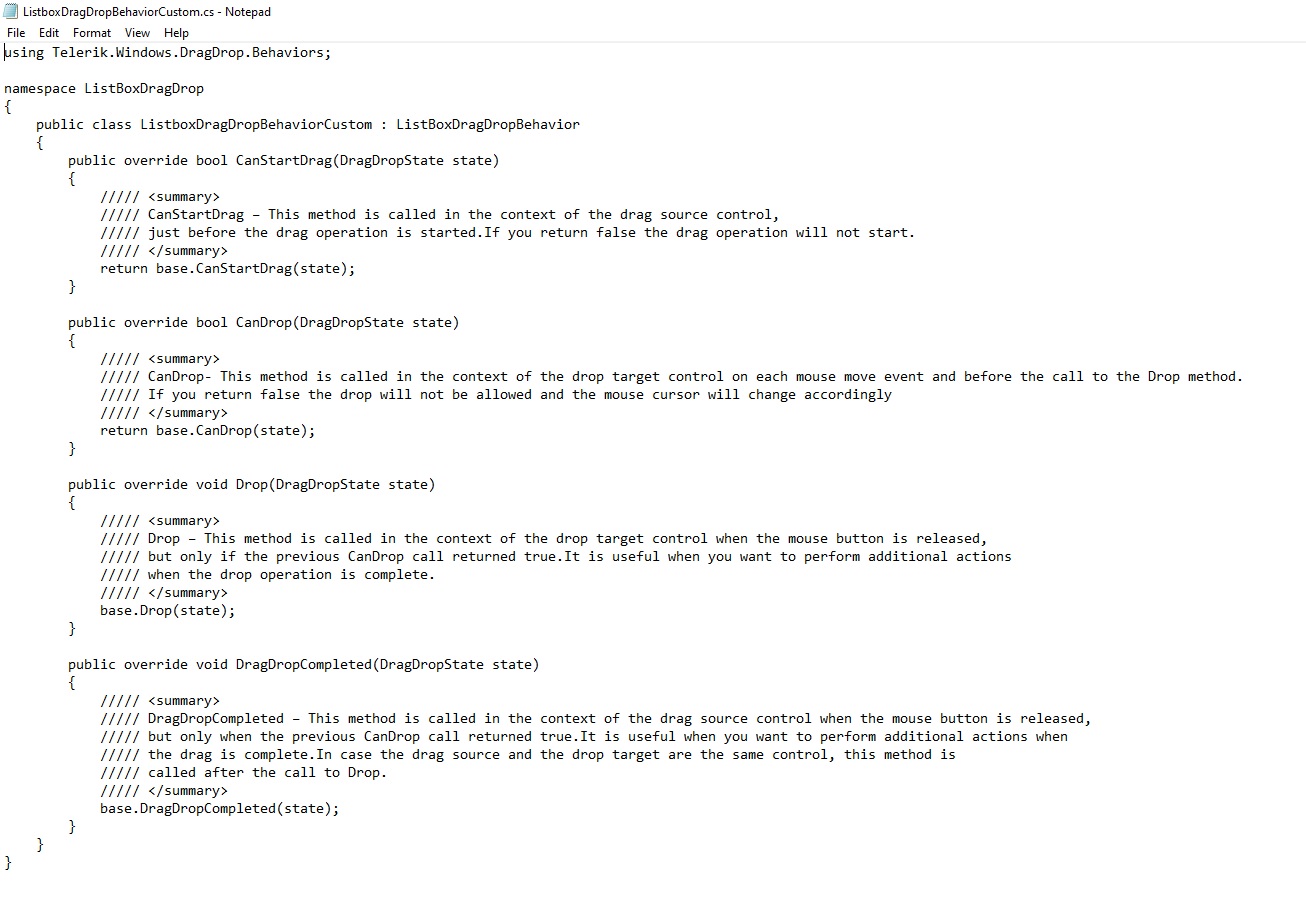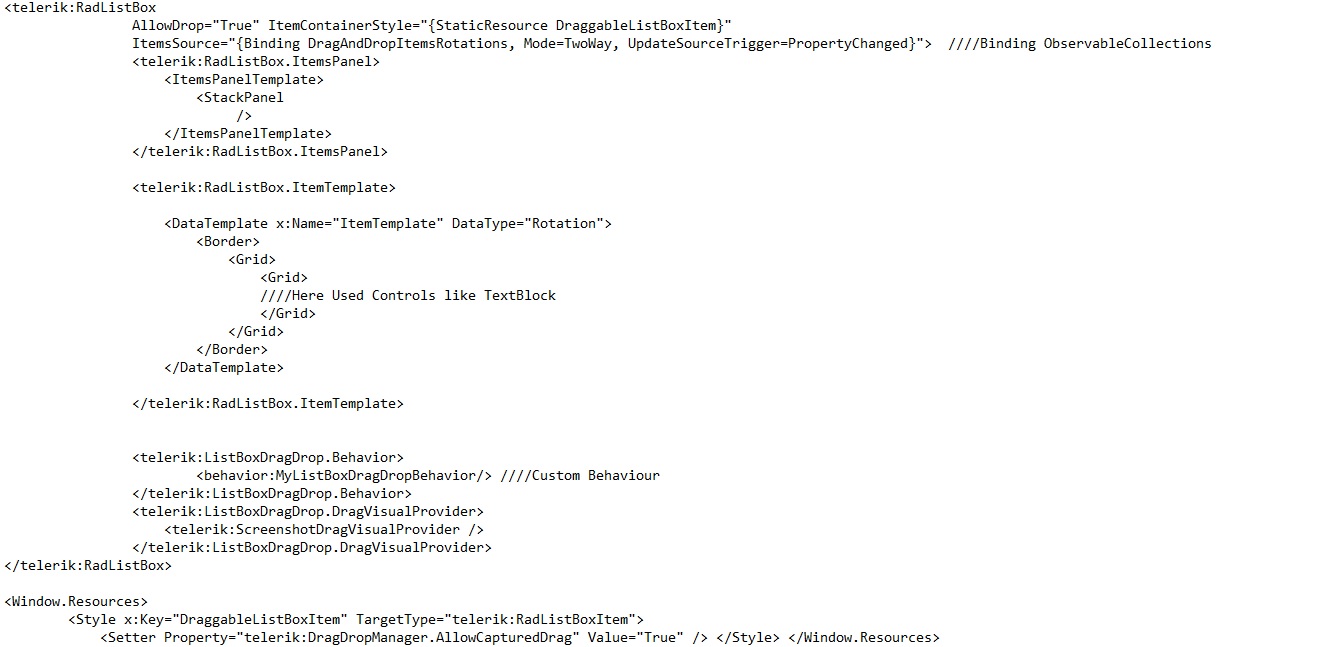 I have a ListBox Control for dragging and dropping listbox items. I used a Custom-Behaviors Class that inherits Telerik.Windows.DragDrop.Behaviors.ListBoxDragDropBehavior.