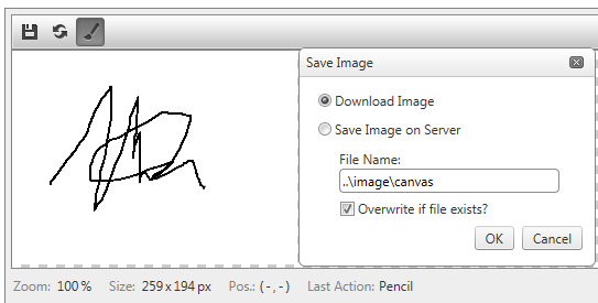 Telerik.Web.UI.ImageEditor.CommandList.Save = function (imageEditor, commandName, args) { imageEditor.saveImageOnServer("", true);}2. Regarding the initial values of the Pencil command, you can set them by enabling the ImageEditor's external dialogs and modifying the initialize() method of the Pencil.ascx dialog in the following way: