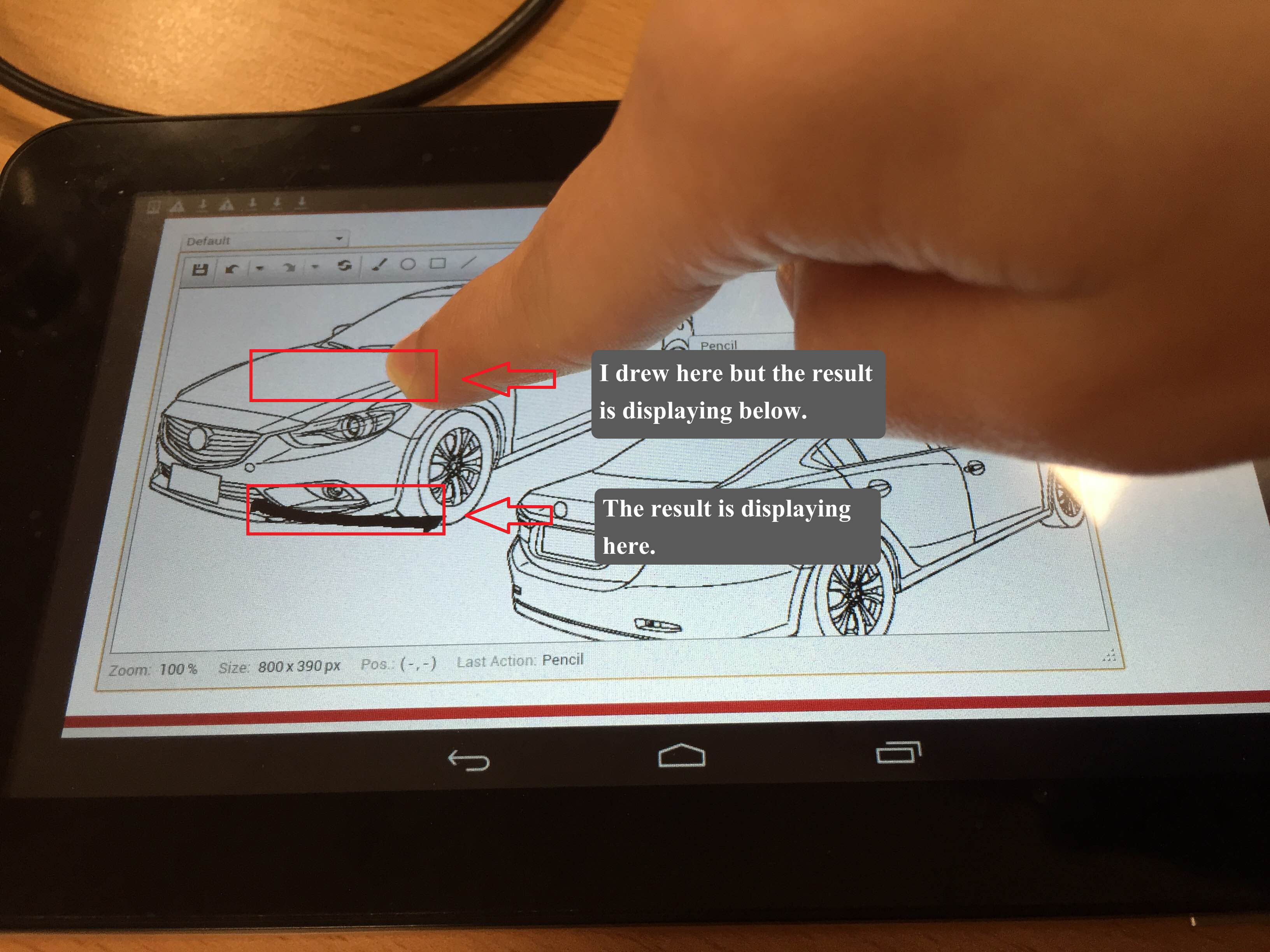 I have an ImageEditor which I would like to allow user to draw on the image. But with my below code, once I click on the pencil using chrome browser on the tablet, it seems like the pencil's focus point is not drawing correctly and it is not showing correct place. The changes of the drawing is displaying about one inch lower than what I drew. Please refer to the attached file. This problem is not happening desk top's browser and it is happening on the tablet's browser and phone's browser.