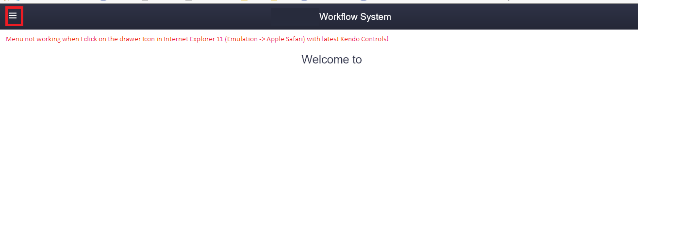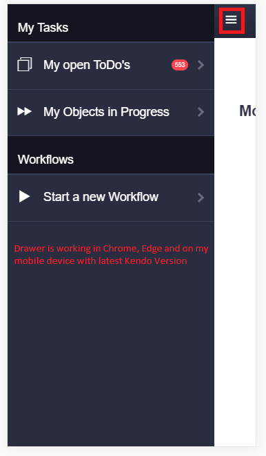 3.) Now if you click the drawer, everything works fine, cause we are in desktop mode of IE 11.