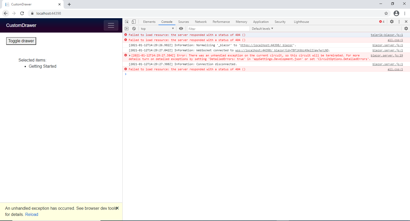 It seems to me that the exception you are getting most likely stems from a JavaScript issue.