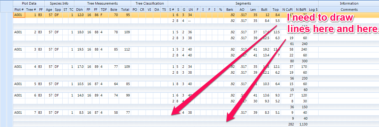 I need to draw 2 lines for group totals. One line will go from S # to Comments.