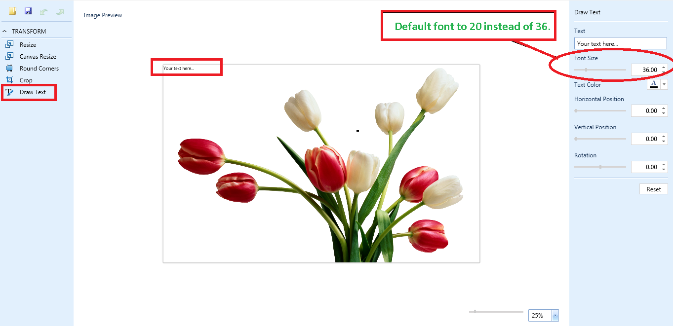 How can I set default font size to 20 instead of 36 for DrawTextTool of RadImageEditor.