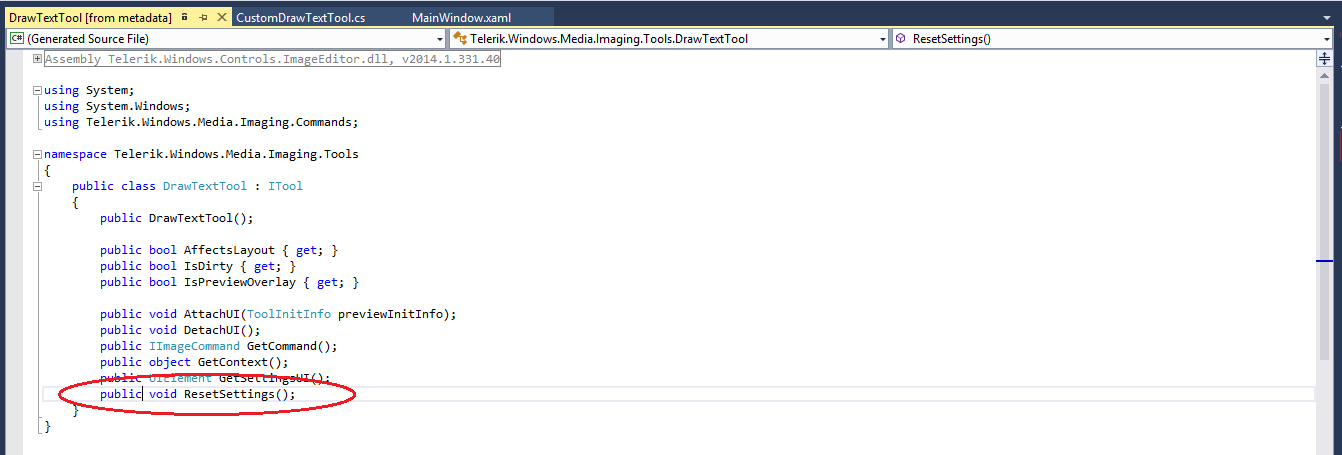 The ResetSettings() method and the DrawTextTool class are marked as public and the signature of the method is as follows: