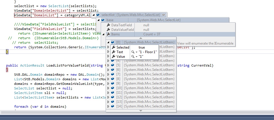 public IEnumerable<SelectListItem> LoadDropDownlistForValueField(string type, string Client, bool required, string CurrentVal) { StB.DAL.Domain domainRepo = new DAL.Domain(); List<StB.Models.Domain> domains = new List<Models.Domain>(); domains = domainRepo.GetDomainValueList(type, Client, CurrentVal, required); SelectListItem sli = null; List<SelectListItem> selectlists = new List<SelectListItem>(); foreach (var d in domains) { sli = new SelectListItem() { Text = d.ShortDescription, Value = d.Value, Selected = d.Value == CurrentVal }; selectlists.Add(sli); } ViewData["FieldValueList"] = selectlists; return (System.Collections.Generic.IEnumerable<SelectListItem>)ViewData["FieldValueList"]; }
