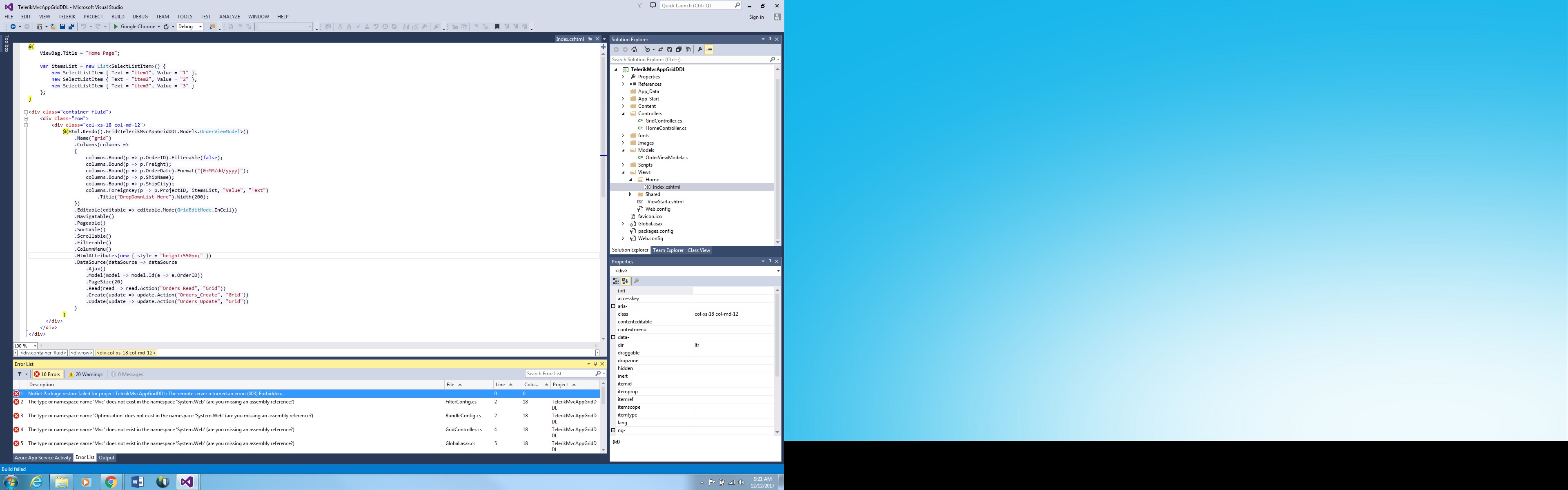 _CategiryGrid.cshtml@model IEnumerable<StB.ViewModels.CategoryViewModel>@{ var imagePath = "~\\Content\\images\\Info.gif";}@*// Ajax Grid // *@@*@(Html.Kendo().Grid(Model).Name("CategoryGrid")*@@(Html.Kendo().Grid<StB.ViewModels.CategoryViewModel>().Name("CategoryGrid") .Columns(columns => { columns.Bound(c => c.ClientCode).Hidden(true); columns.Bound(c => c.Category).ClientGroupHeaderTemplate("Category: " + "#= value#").Width(60); columns.Bound(c => c.Attribute).Title("Attribute").Width(100); columns.Bound(c => c.Description).Width(150); //.ClientTemplate(@"<div><img id='tooltipIconItem' src='@imagePath' ToolTip =#:data:ToolTip# /></div>" + @"<div> @Html.Label('fieldValueItem', #:data:Description#)</div>"); columns.Bound(c => c.Required).Width(30); //.ClientTemplate(@"<div><img id='reqEdit' src='~\\Content\\images\\RedStar.gif' /></div>"); columns.Bound(c => c.FieldType).Hidden(true); columns.Bound(c => c.DomainID).Hidden(true); columns.Bound(c => c.AttrType).Hidden(true); columns.Bound(c => c.Tooltip).Hidden(true); columns.Bound(c => c.FieldValue).Width(80).Title("Value").EditorTemplateName("FieldValueEditor").ClientTemplate("#:FieldValue #") .HtmlAttributes(new { id = "ddlFieldvalues" }); //.EditorTemplateName("FieldValueEditor"); }) .Editable(editabel => editabel.Mode(GridEditMode.InCell).Enabled(true)) .Navigatable() .Scrollable() .Groupable() .Sortable() .Selectable(selectable => selectable.Mode(GridSelectionMode.Single).Type(GridSelectionType.Cell)) .AutoBind(false) .Pageable(pageable => pageable .ButtonCount(2)) .DataSource(datasource => datasource .Ajax() .Read(read => read.Action("DisplayGridData", "HierarchyBuilder").Type(HttpVerbs.Post)) .Update(update => update.Action("UpdateCategory", "HierarchyBuilder")) .ServerOperation(false) .Batch(true) .PageSize(60) .Model(model => model.Id(p => p.Attribute)) .Model(model => { model.Field(f => f.Category).Editable(false); model.Field(f => f.Attribute).Editable(false); model.Field(f => f.Description).Editable(false); model.Field(f => f.Required).Editable(false); model.Field(f => f.FieldValue).Editable(true).DefaultValue("1"); }) .Aggregates(aggregates => { aggregates.Add(p => p.Category == p.Category).Count(); }) .Group(groups => groups.Add(m => m.Category)) ) .Events(events => { events.Edit("onCategoryGridEdit").DataBound("onCategoryGridDataBound").Change("onCategoryGridChange"); }) )@Html.Hidden("ClientCode", HttpContext.Current.Session["ClientCode"])