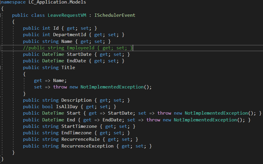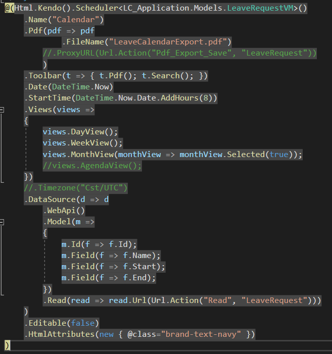 Is there a way to add a dropdown to filter events in the scheduler? I can't seem to find an example to accomplish this. Would this entail using a resource in the scheduler? I've added images of my scheduler and events. Each event is a leave request from a user and has a department id. I'd like to filter the scheduler with a drop down based on department id.