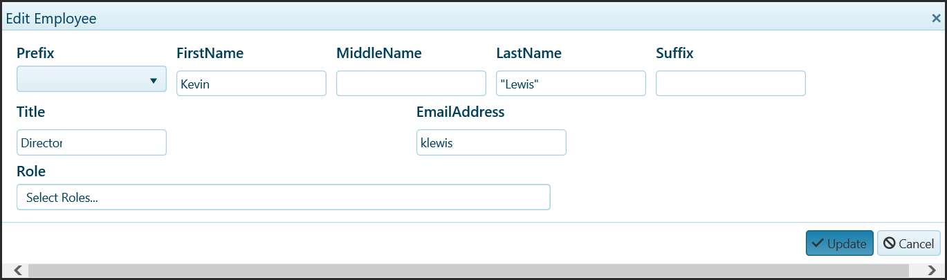 1. @(Html.Kendo().Grid<.Api.Common..Models.WebUser>()<br> .Name("membersGrid")<br> .Columns(columns =><br> {<br> columns.Command(command => { command.Edit(); command.Destroy().Text("Del"); }).Width("15%");<br> columns.Bound(p => p.CST_KEY).Visible(false);<br> columns.Bound(p => p.FullName).Width("20%").Filterable(ftb => ftb.Cell(cell => cell.Operator("contains").SuggestionOperator(FilterType.Contains)));<br> columns.Bound(p => p.Role).Width("25%").Filterable(ftb => ftb.Cell(cell => cell.Operator("contains").SuggestionOperator(FilterType.Contains)));<br> columns.Bound(p => p.Title).Width("20%").Filterable(ftb => ftb.Cell(cell => cell.Operator("contains").SuggestionOperator(FilterType.Contains)));<br> columns.Bound(p => p.EmailAddress).Width("20%").Filterable(ftb => ftb.Cell(cell => cell.Operator("contains").SuggestionOperator(FilterType.Contains)));<br> columns.Bound(p => p.Prefix).Visible(false);<br> columns.Bound(p => p.Suffix).Visible(false);<br> columns.Bound(p => p.RoleKey).Visible(false);<br> columns.Bound(p => p.OrganizationMemberKey).Visible(false);<br><br> }).Filterable(filterable => filterable<br> .Extra(false)<br> .Operators(ops => ops<br> .ForString(str => str.Clear()<br> .Contains("Contains")<br> .StartsWith("Starts With")<br> .IsEqualTo("Is Equal To")<br> .IsNotEqualTo("Is Not Equal To")<br> )))<br> .Editable(editable => editable.Mode(GridEditMode.PopUp).TemplateName("MemberEdit").Window(w => w.Title("Edit Employee").Width(1100)))<br> .Pageable(pager => pager.AlwaysVisible(false).PageSizes(new List<object> { 5, 10, 15, 20 }))<br> .Sortable()<br> .Filterable(ftb => ftb.Mode(GridFilterMode.Row))<br> .HtmlAttributes(new { style = "width:100%;" })<br> .DataSource(dataSource => dataSource<br> .Ajax()<br> .PageSize(10)<br> .Events(events => events.Error("error_handler"))<br> .Model(model => model.Id(p => p.CST_KEY))<br> .Read(read => read.Action("ListMembers", "Home"))<br> .Update(update => update.Action("EditingPopup_Update", "Home"))<br> .Model(model =><br> {<br> model.Field(m => m.Title);<br> model.Field(m => m.Prefix);<br> model.Field(m => m.PrefixKey);<br> model.Field(m => m.Suffix);<br> model.Field(m => m.FirstName);<br> model.Field(m => m.MiddleName);<br> model.Field(m => m.LastName);<br> model.Field(m => m.OrganizationKey);<br> model.Field(m => m.FullName);<br> model.Field(m => m.CustomerId);<br> model.Field(m => m.OrganizationMemberKey);<br> model.Field(m => m.EmailAddress);<br> model.Field(m => m.CST_KEY);<br> model.Field(m => m.Role);<br> model.Field(m => m.RoleKey);<br> model.Field(m => m.RoleList).DefaultValue(new List<Aamva.Api.Common.WebSite.Models.WebUserRole>());<br> }<br> )<br> )<br> )