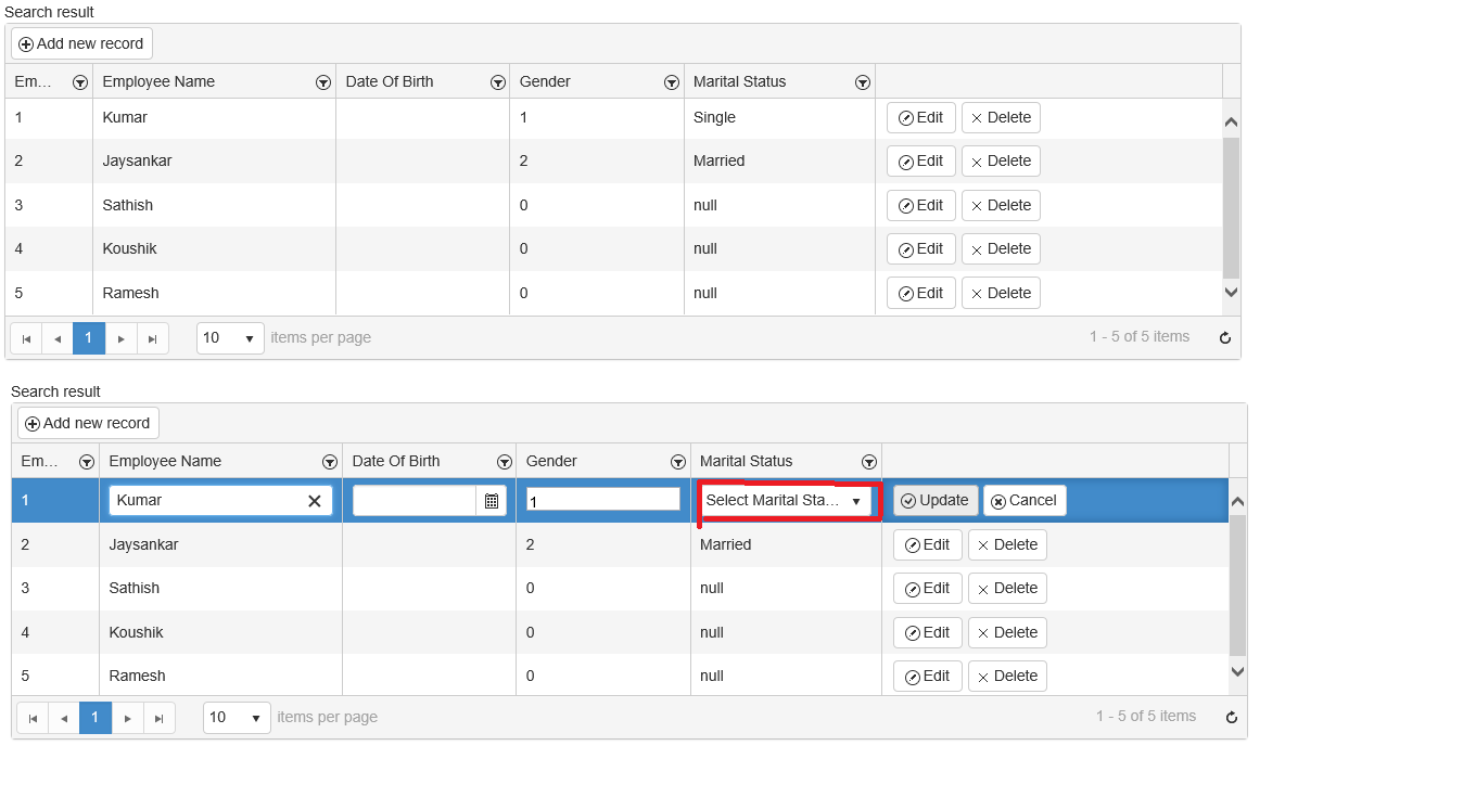 empList.Add(new EmployeeViewModel() { EmployeeId = 1, EmployeeName = "Kumar", GenderId=1, MariatalStatusId=1 , MariatalStatus="Single" });