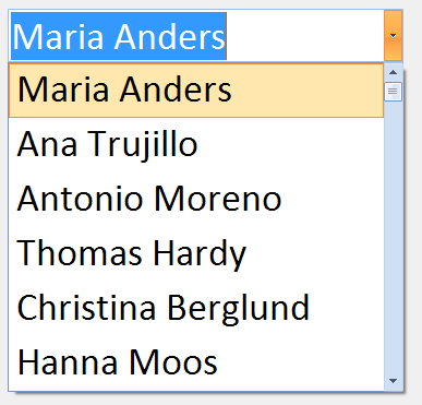 Dim font As New Font("Calibri", 27, FontStyle.Regular)Private Sub Form1_Load(sender As Object, e As EventArgs) Handles MyBase.Load Me.CustomersTableAdapter.Fill(Me.NwindDataSet.Customers) Me.RadDropDownList1.DataSource = Me.CustomersBindingSource Me.RadDropDownList1.DisplayMember = "ContactName" Me.RadDropDownList1.ValueMember = "CustomerID" Me.RadDropDownList1.DropDownStyle = Telerik.WinControls.RadDropDownStyle.DropDown Me.RadDropDownList1.AutoCompleteMode = AutoCompleteMode.Suggest Me.RadDropDownList1.Font = font Me.RadDropDownList1.DropDownListElement.Popup.Font = font Me.RadDropDownList1.AutoSizeItems = True Me.RadDropDownList1.DropDownListElement.AutoCompleteSuggest.DropDownList.Popup.Font = fontEnd SubI hope this information helps. Should you have further questions, I would be glad to help.