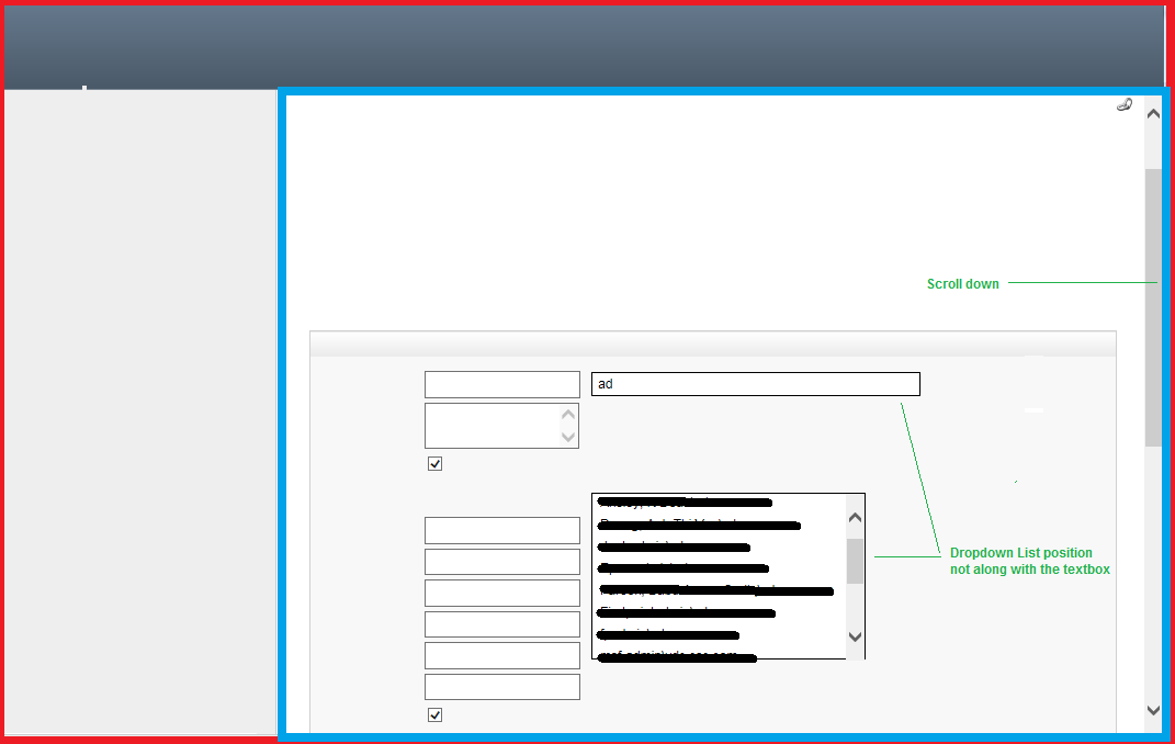 The issue is that, after the dropdown list appears (see FirstAppear.png), I scroll down the Blue area. The dropdown list is not move along with the textbox, but seems to be fixed at the screen (see AfterScrolling.png)