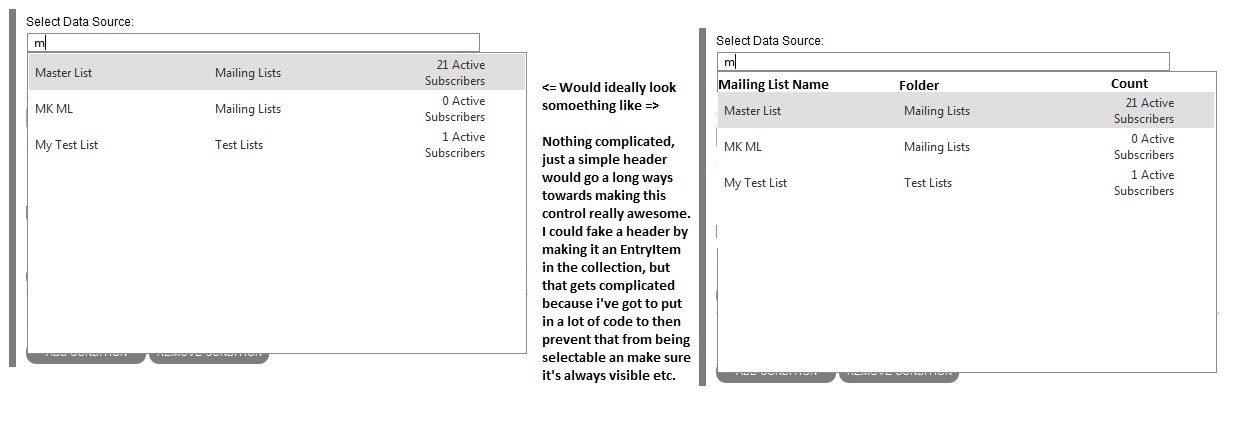Is there a recommended way to create the display aspects of the RadComboBox with styled multicolum display with a header, but also have the tokenized aspect of the autocomplete textbox? The auto complete textbox seems like it does almost everything that i need and i've created a custom template , which works great except that i can't put a header at the top. I'm using a simple datatable from my database as the data source, but it would be very useful to put a single column header across the top of the list. it seems to me that this would be a very common use case scenario. it would also be very useful from a formatting standpoint to be able to have a header where i can define a single <table> and then an item template that is just a <tr> .. </tr> so that like columns in each row will occupy the same amount of space. Right now i can overcome that by using a fixed pixel width in each cell, but a % width is disasterous. The RadComboBox seems to address that problem but it doesn't have the same tokenizer capability that the auto complete textbox has. With the autocomplete textbox i can press the backspace or X and the whole item is removed. in the RadComboBox as i hit backspace it just partially erases the text and i have to hope that my users will continue to erase the whole thing..