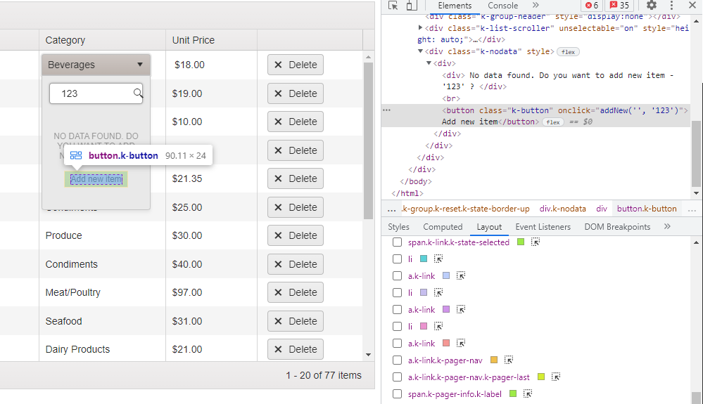 <button class="k-button" onclick="addNew('#: instance.element[0].id #', '#: instance.filterInput.val() #')">Add new item</button>