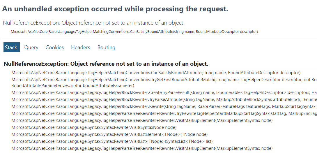 Stack Trace: NullReferenceException: Object reference not set to an instance of an object. on Microsoft.AspNetCore.Razor.Language.TagHelperMatchingConventions.TryGetFirstBoundAttributeMatch
